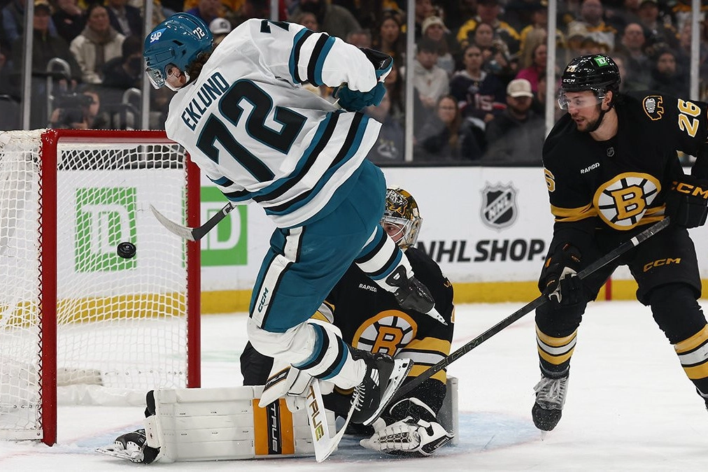 İdman.Biz xəbər verir ki, gənc forvard "Boston Bruins"lə qarşılaşmada qeyri-adi əzmkarlıq nümayiş etdirib. Hücum zamanı rəqib qapıçı Ceremi Sueymenin qaytardığı şayba havaya qalxıb. Həmin anda Sueymenin hokkey çubuğuna ilişərək tarazlığını itirən və arxası üstə yerə yıxılan Eklund, havada süzülən şaybanı gözündən qaçırmayıb. O, yerə yıxıldığı anda havada şaybaya zərbə endirərək onu qapı toruna göndərib.