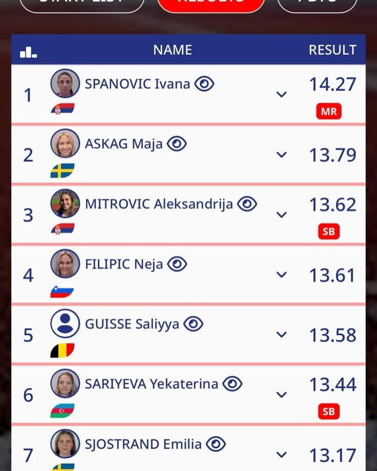 It was reported that our athlete achieved a result of 13.44 meters in the triple jump at the Gold-level "Belgrade Indoor Meeting" competition, and was awarded sixth place.