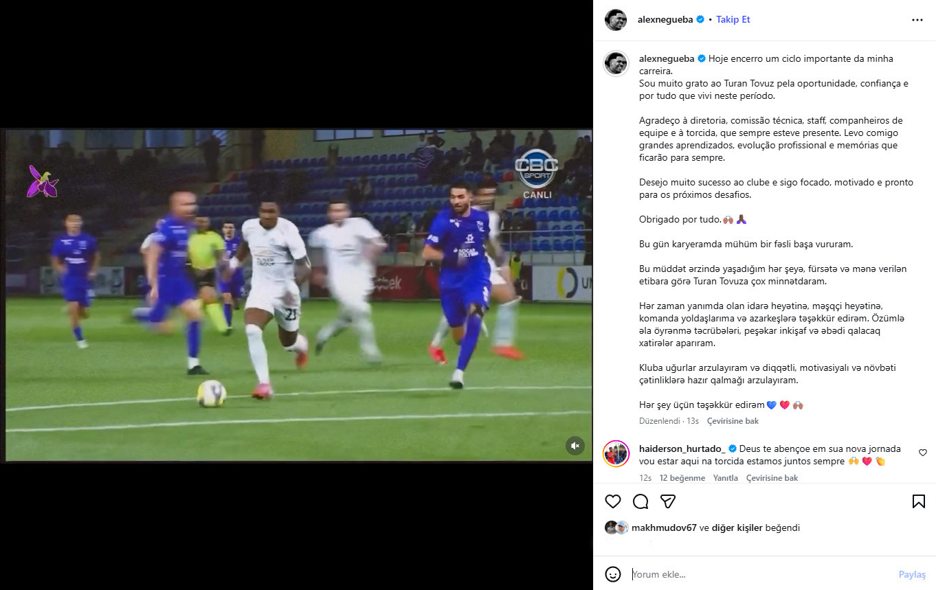 "Bu müddət ərzində yaşadığım hər şeyə, mənə verilən fürsətə və etibara görə "Turan Tovuz"a çox minnətdaram. Hər zaman yanımda olan klubun İdarə Heyətinə, məşqçilərə, komanda yoldaşlarıma və azarkeşlərə təşəkkür edirəm. Özümlə təcrübələr, peşəkar inkişaf və əbədi qalacaq xatirələr aparıram. Kluba uğurlar, növbəti çətinliklərə hazır olmağı arzulayıram. Hər şey üçün təşəkkür edirəm".