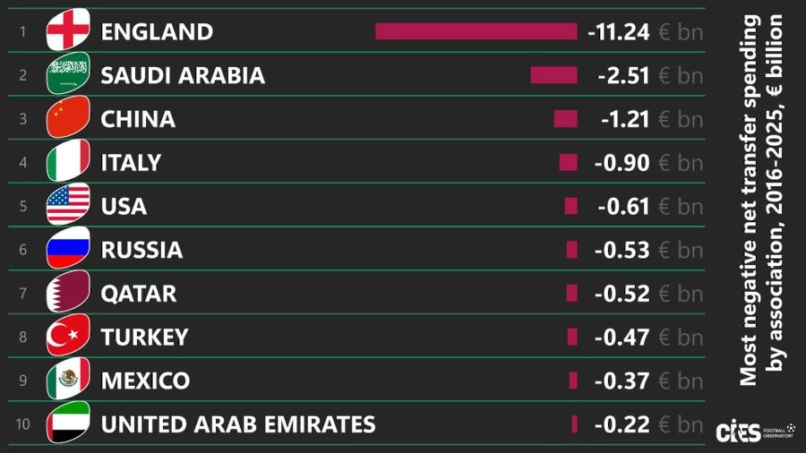 İngiltərə klubları 2016-cı ildən bu günə 11,24 milyard avro zərər ediblər. İlk "üçlüy"ü Səudiyyə Ərəbistanı (- 2,51 milyard avro) və Çin (- 1,21 milyard avro) tamamlayıb. Növbəti yerdə İtaliya (- 900 milyon avro) qərarlaşıb. İlk "beşliy"i isə - 610 milyon avro ilə ABŞ tamamlayıb.