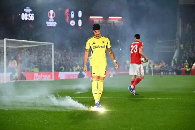 UEFA Avropa Liqasının pley-off mərhələsinin cavab oyununda "Fənərbağça" İngiltərədə "Nottingem Forest"in qonağı olub. Mübarizənin elə ilk dəqiqəsində "sarı-lacivərdlilər"in yer aldığı tribunadan sahəya məşəl atılması səbəbindən qarşılaşma qısa müddətə dayanıb.