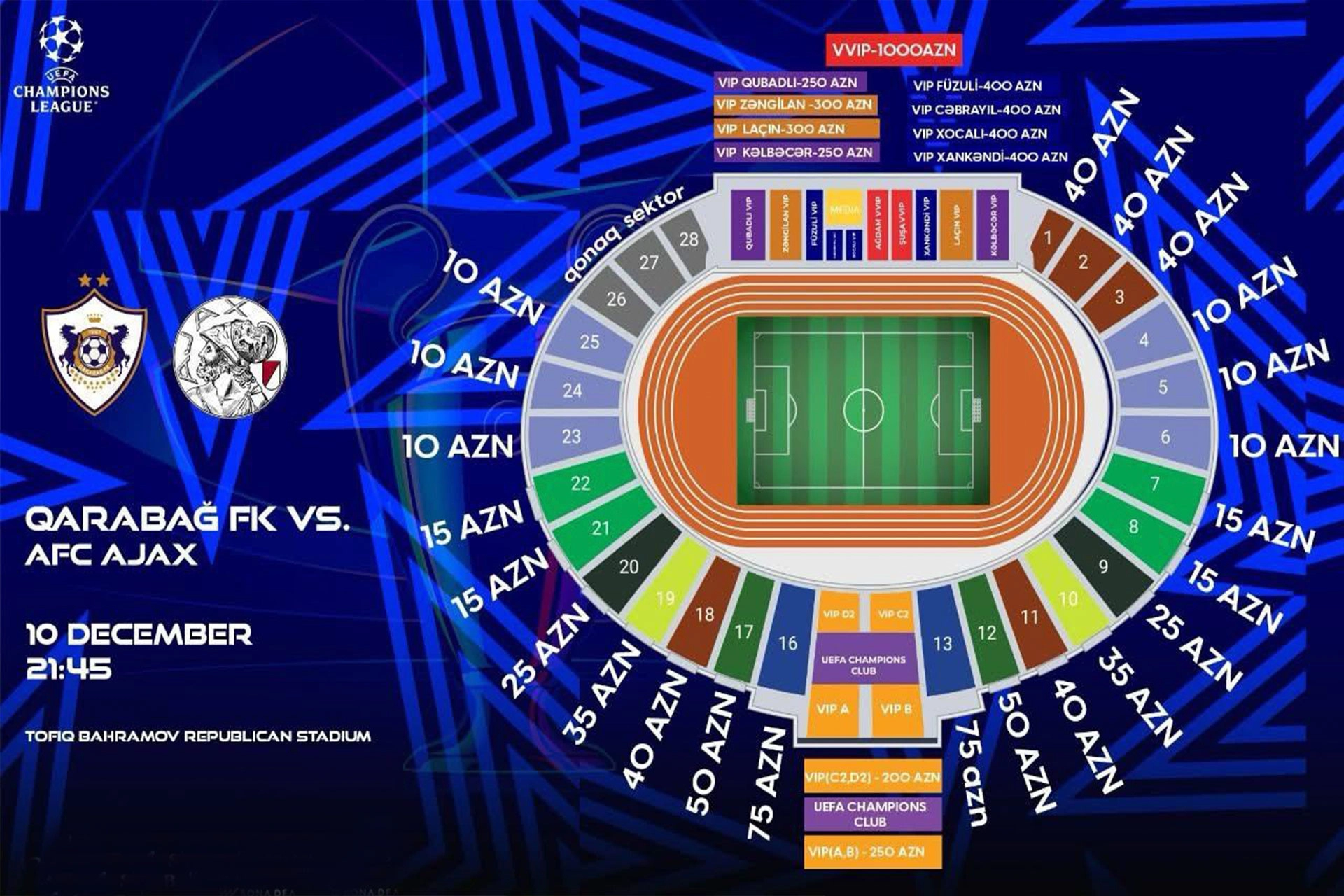 Azərbaycanın "Qarabağ" futbol klubunun UEFA Çempionlar Liqasının əsas mərhələsinin VI turunda Niderlandın "Ayaks" komandası ilə keçirəcəyi oyunun biletləri bu gün saat 15:00-dan satışa çıxarılıb.