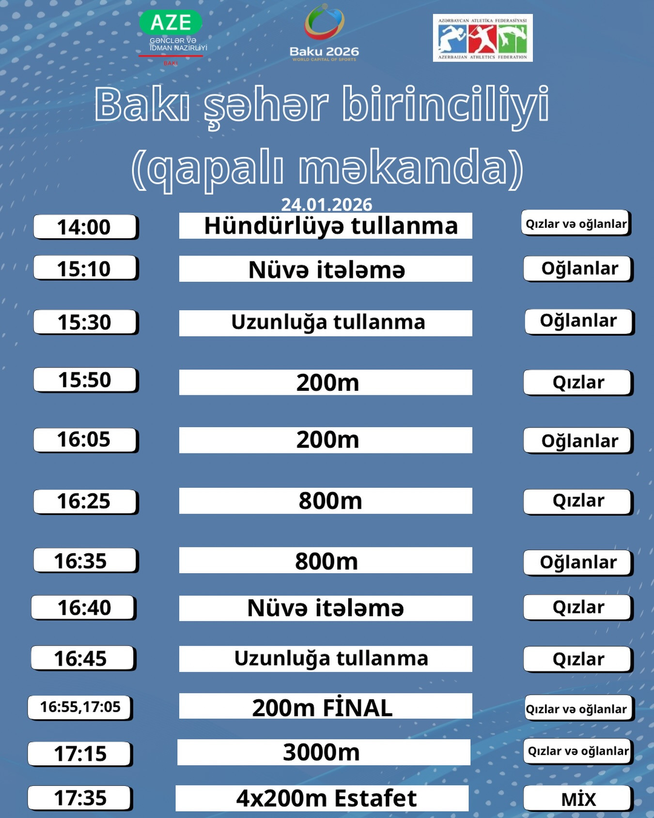 İdman.Biz bildirir ki, yarışın ilk günündə 60 metr, 400 metr məsafəyə qızlar və oğlanlar arasında qaçış, üçtəkanla tullanma və 1500 metr məsafəyə qaçış yarışı keçirilib.