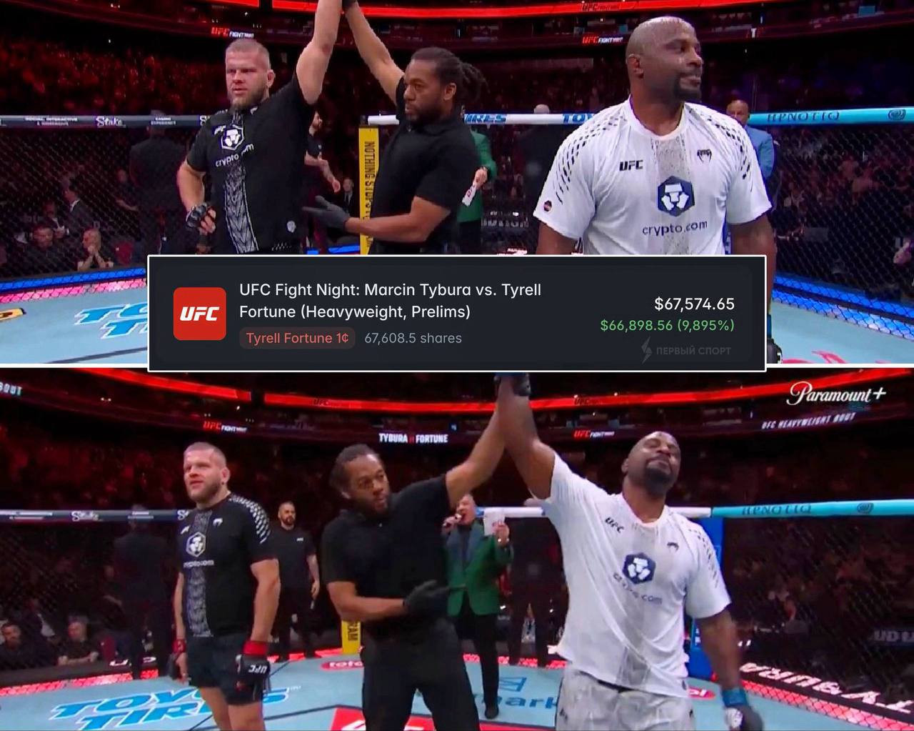 Фортун, подумав, что проиграл во время объявления, уже разочарованно покинул октагон. Однако через минуту ошибка была осознана, и американского бойца вызвали обратно и официально объявили победителем.