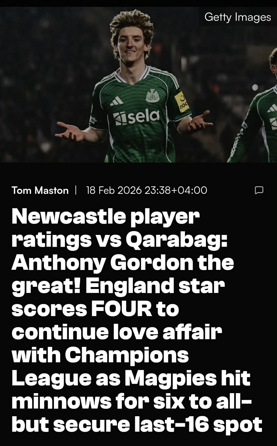 Известное издание "The Guardian" особо отметило четыре гола, забитые Энтони Гордоном в первом тайме, оценив этот результат как "полное доминирование над "Карабахом", и написало, что "Ньюкасл" сделал уверенный шаг к следующему этапу в Лиге чемпионов.