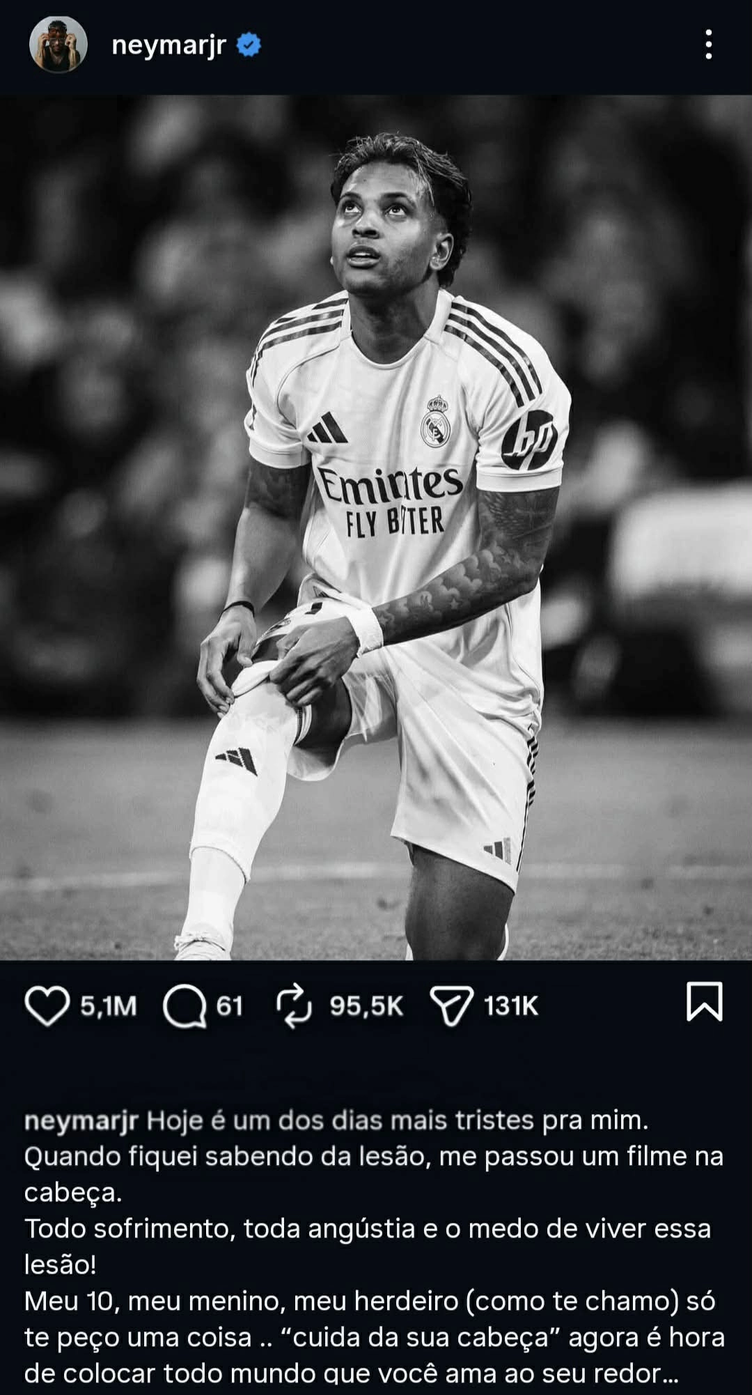 Бразильский звездный футболист Неймар отправил эмоциональное сообщение своему травмированному соотечественнику Родриго через социальные сети. Он сказал, что был очень опечален, услышав, что Родриго получил травму. Sport24.az сообщает, что опытный нападающий поделился этим в своем личном аккаунте в Instagram.