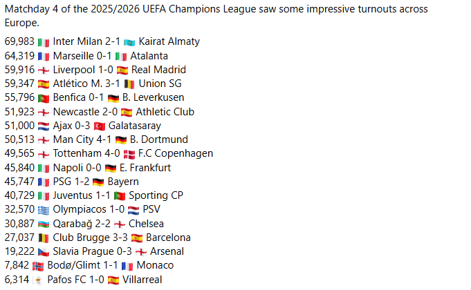 Объявлено количество болельщиков на стадионах в четвертом туре основного этапа Лиги чемпионов УЕФА.
