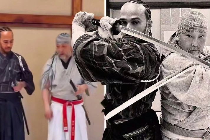 "Formula 1" pilotu Lewis Hamilton, "Kill Bill" filmindeki çalışmalarıyla tanınan samuray ustası Tetsuro Shimaguchi'nin rehberliğinde katana kullanma tekniklerinde ustalaşıyor.
