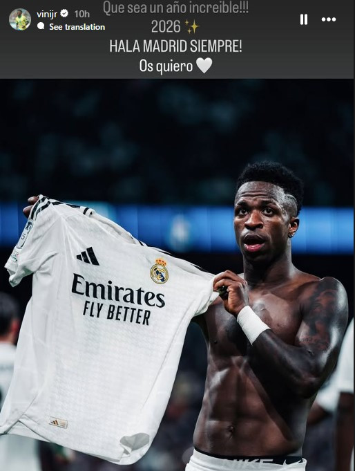 İdman.Biz'in haberine göre Vinicius, sosyal medyada Real Madrid formasıyla çekilmiş bir fotoğrafını paylaşarak, "Harika bir yıl olsun. Her zaman 'Hala Madrid'. Hepinizi seviyorum" diye yazdı.